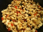 Heat pan over medium-high heat. Always remember when cooking meat to let your pan get hot before you put the meat in. This will keep your meat from losing all of its juices and essentially boiling itself, leaving it flavorless and rubbery. Also use a large enough pan so that when the meat is dropped into the pan, the temperature does not plummet. Your pan should let out a good sizzle when the chicken is dropped in. Spread the chicken out into one layer in the pan. Do not stir until the meat is seared (browned) on the bottom-side. This is especially true when you are cooking with a skillet that does not have a non-stick surface. If you let it sear before turning it, you will not end up with your chicken super glued to the bottom of your pan. Sprinkle red bell peppers over the top of the chicken after a minute or two when the pan has recovered its heat. Turn the chicken with a spatula and repeat the searing process on the other sides until the chicken is fully cooked.