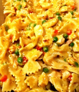 Drain pasta and spoon 3/4 into pan containing chicken sauce. Stir until pasta is coated. I generally leave about 1/4 of the noodles out so the dish is nice and creamy. (Save them for later.)