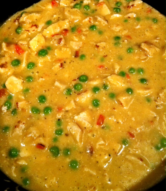 Reduce heat to low. Add cream of chicken soup, milk and peas. Stir together and return to heat.