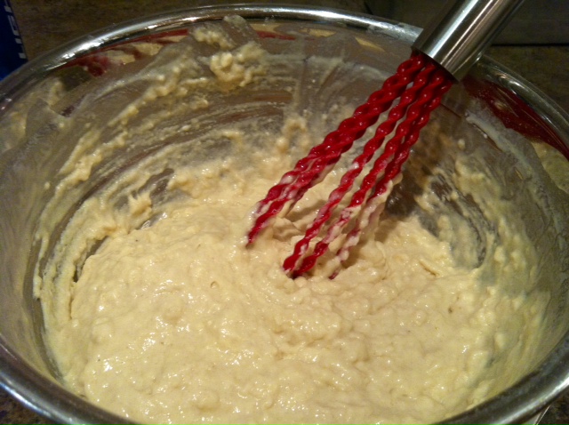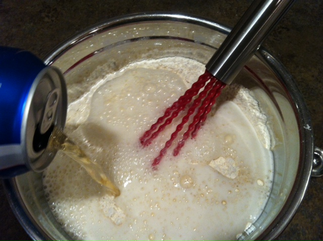 Add beer. It will be really foamy. Mix with a rubber spatula or a whisk. Do not overmix or it will become tough. Once the beer is mixed in evenly, stop. You want it to be a little lumpy.