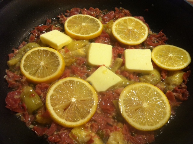 Scrape up any browned bits on bottom of pan and add white wine to deglaze (moisten the brown bits stuck to the pan). Add lemon slices and simmer sauce over medium heat until reduced by half. Add remaining butter, stirring over low heat until incorporated, remove lemons. (The recipe says to leave your lemons in until nothing but the rind is left but I think that would be overpowering…. I suggest removing them long before that… just taste to be sure).