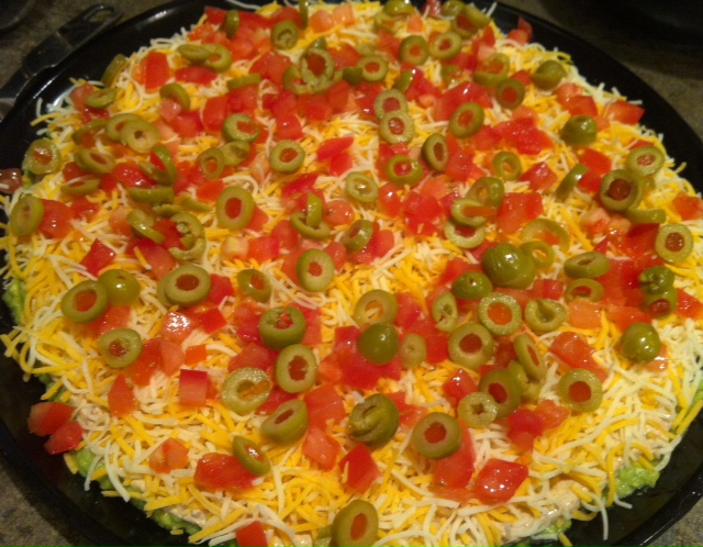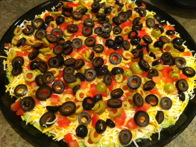 Layer 1: Place avocados in a medium-sized mixing bowl. Add garlic salt (or fresh garlic and salt), chili powder, lemon juice and salt (if needed). Using pastry cutter or fork to smash avocados until spreadable consistency. Taste to be sure your seasoning is sufficient.