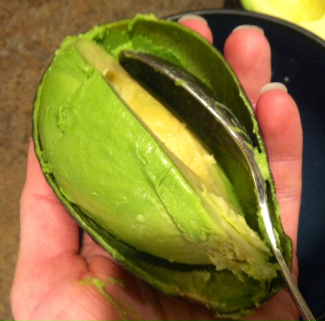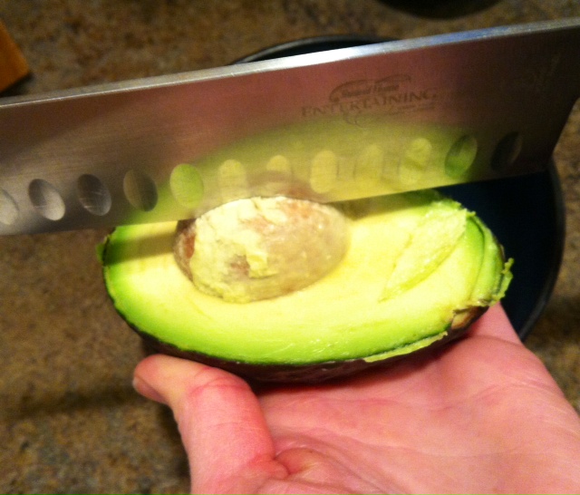Slice avocado in half (slicing through the flesh only, leaving seed in tact). Twist each side in opposite directions to separate. Hold seed half of avocado in palm of hand. Using a LARGE sharp chef’s knife to lightly tap seed (do not try this with a small or dull knife). This should lodge the knife into the seed. Turn knife counter-clockwise, 90 degrees. Your seed will come out of the avocado and stick to the knife. Knock the seed in the opposite direction on the side of a bowl to remove it from the knife (do not try to pull seed off with your hand). One of my best friends would also tell you not to stab the knife downward into the seed. You will end up at the ER getting your hand stitched back together. 🙂