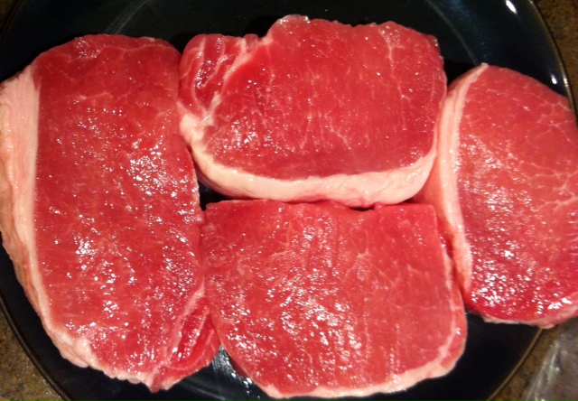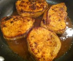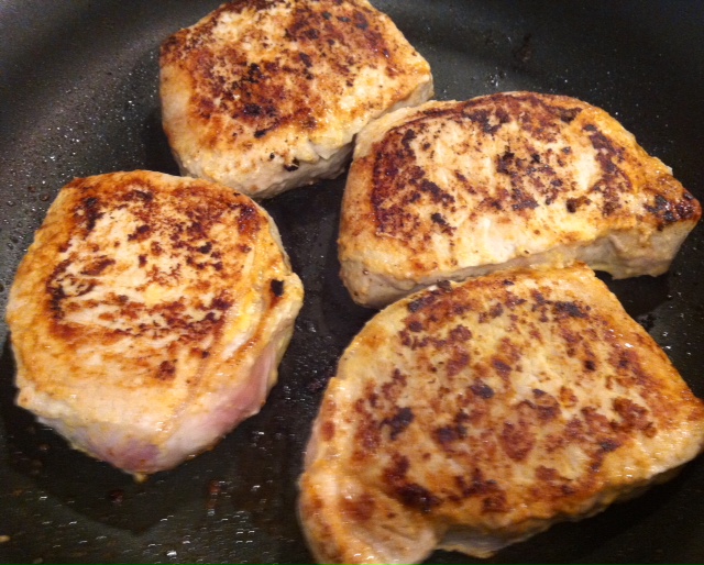 4 pork loin chops – Make sure you buy pork chops that are firm and pink. Try to avoid the chops that are soft and dark in color or have any blemishes or brown spots. Also be sure that the pork chops are not pumped with water or any other additives. Many times, grocery stores will plump up your meat (chicken, pork, seafood, etc) with water to beef up the weight, and therefore be able to charge you more for less product. It is a good idea to try to avoid the meats that say “may contain xx% water.” This can alter your cooking because once heated, you may be dealing with a lot of water escaping the meat into your pan, which can hinder your ability to get a good sear. It is harder to get a good end result. SO, try to buy meats that appear to be somewhat dry and not soaking in a pool (Read your frozen packaging too). Whew… moving right along…