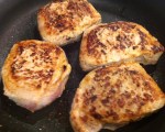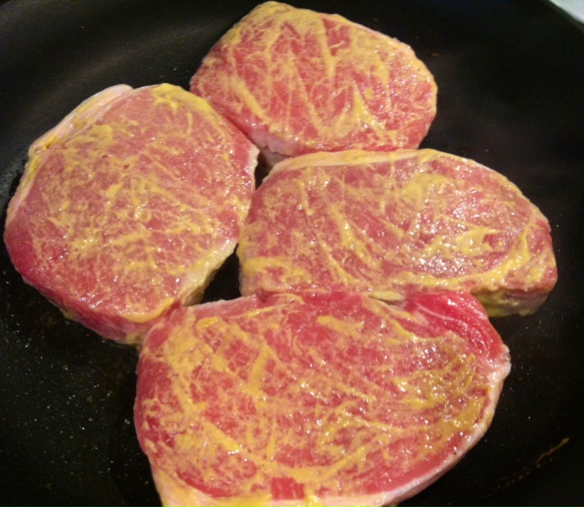 Start by coating the pork chops with mustard. Heat olive oil in large skillet over medium-high heat. Get it hot enough so that when you lay your chops in, you hear a good, loud sizzle.