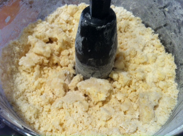Combine 2/3 of flour along with the sugar and salt the bowl of a food processor. Pulse twice to incorporate. Spread butter chunks evenly over surface. Pulse until no dry flour remains and dough just begins to collect in clumps, about 25 short pulses.