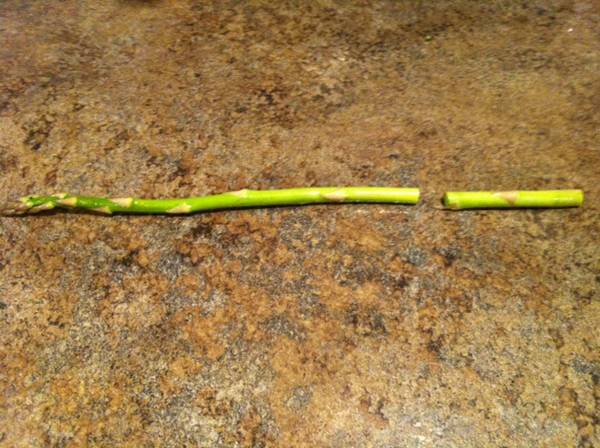 - Rinse asparagus. Bend one spear slightly starting at the cut end until the asparagus snaps. This will be a good indicator of where the woodiness ends and the tender asparagus begins. Line the other asparagus up and cut even with snapped spear. Cut into bite sized pieces.