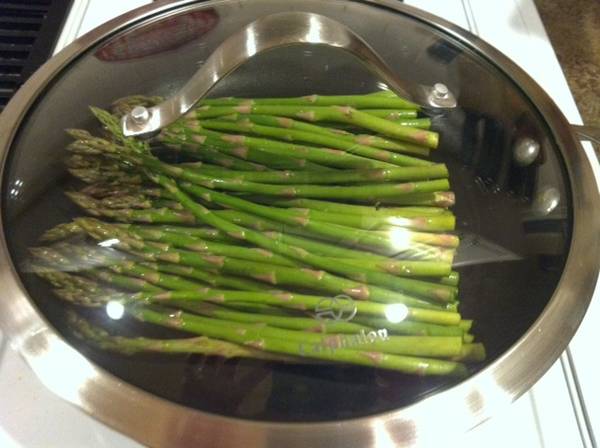 Place enough water in a medium skillet to slightly coat the bottom of the pan. Cover and bring to a boil. Place spears in water and cover again. Steam for 3-5 minutes or until your spears are tender but still firm. I used very small spears and 3 minutes was perfect. If you use the thicker spears you will need to increase that time.