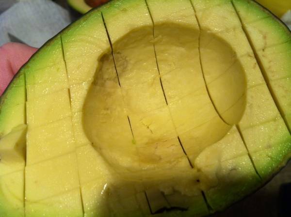 Cut open avocado and de-seed (If you need tips on this, see 7-layer dip recipe). Run knife through avocado all the way to the peel making 1/2 inch squares (see picture above). Run a large spoon between peel and flesh to remove the avocado.