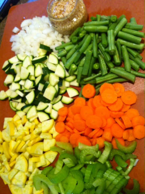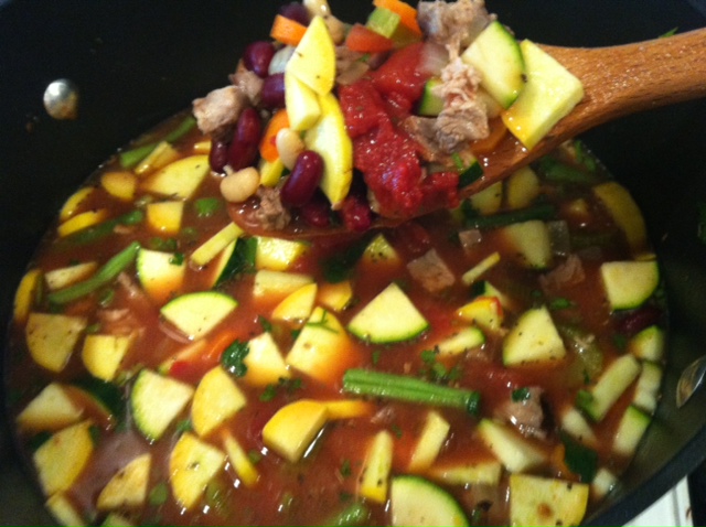 Prepare all of your veggies. In a large pan, saute onion, garlic, celery and carrots in 1 Tbsp butter until onions are translucent. Add to large pot. Add grean beans, zucchini , parsley, beans, diced tomatoes, tomato sauce, tomato paste, meat, beef base, water, basil, garlic powder and ground pepper.
