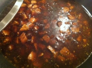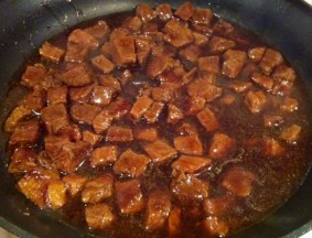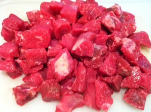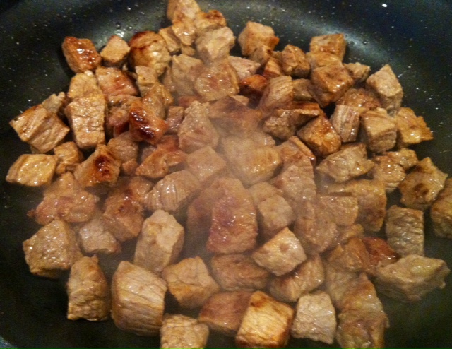 Cut meat into 1″ squares. Melt shortening in a large skillet over medium-high heat, brown meat on all sides. As always, be sure to preheat your pan before adding your meat so you sear in all of the juices instead of letting them seep out and boil your meat. I would recommend breaking the meat up into two batches to brown it. This way your pan stays nice and hot and reduces your chance of boiled meat. If you do happen to get a lot of juice seeping out of the meat, soak it up with a paper towel and turn the heat up in your pan until it gets smokin hot again.
