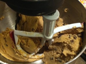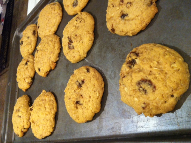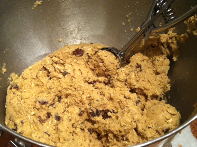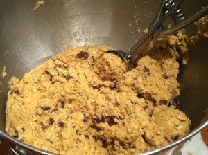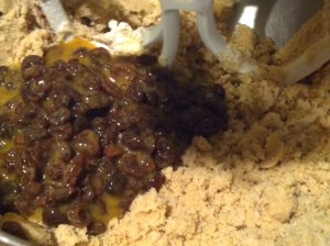 Add your egg/raisin mixture and mix until evenly incorporated. Add oatmeal. Dough will be very stiff.