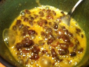 Combine eggs, raisins, and vanilla. Cover with plastic wrap and let stand for one hour.