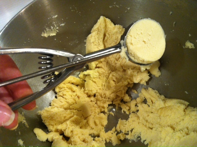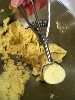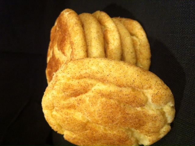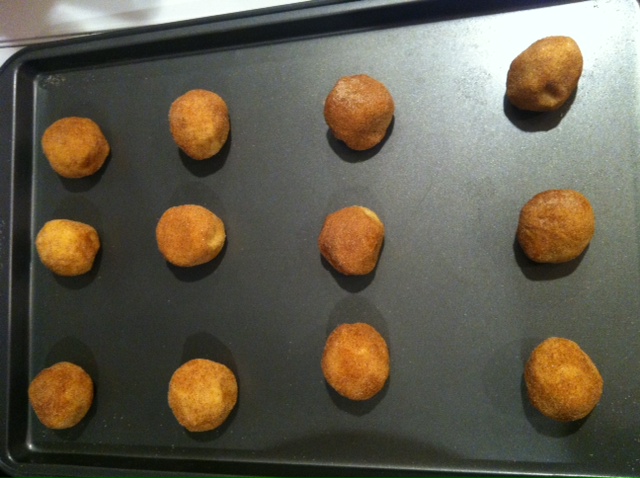 In a small bowl, stir together the 1/4 cup sugar and 3 tsp cinnamon. Roll dough into walnut sized balls (or use your medium-sized cookie scoop). Roll balls in the cinnamon-sugar mixture. Place them on an ungreased cookie sheet, two inches apart.