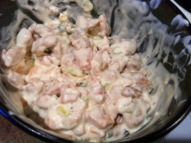 Mix cream cheese and margarine together until smooth. Add salt, pepper, 2 Tbsp milk and onion. Stir in chicken.