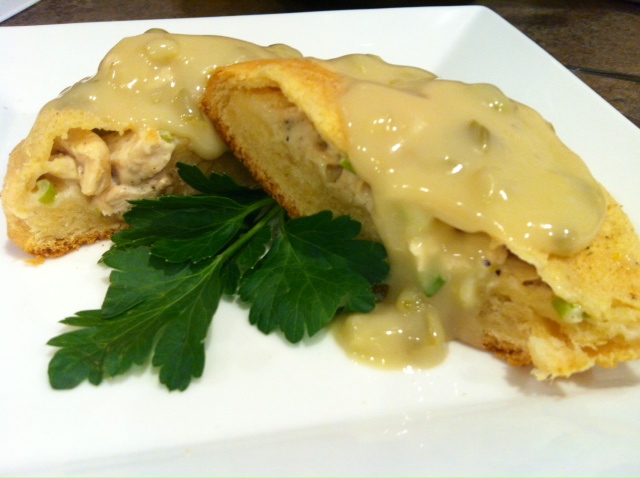 Mix soup together with 1 and 1/2 to 2 cups of milk until it reaches the consistency of a thick gravy. Heat in the microwave. Spoon over Chicken Pockets and serve.
