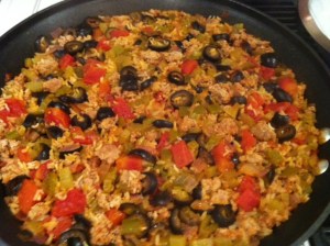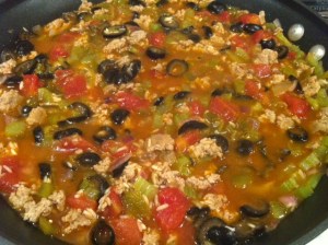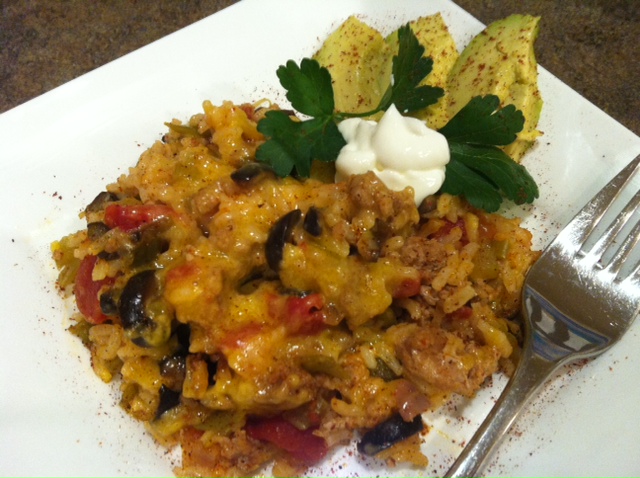 In an oven-safe skillet, brown ground turkey (or beef) with celery and onion. Drain fat if there is any. Add rice, tomatoes, olives, green chiles, beef base, water, chili powder, Worcestershire and pepper (everything except the cheese and sour cream). Bring to a boil. Cover and bake for one hour. Remove from oven and top with cheese. Cover and let stand for 10 minutes before serving.
