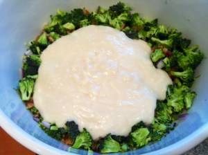 Pour dressing over broccoli mixture and stir until evenly mixed. Chill for at least one hour before serving.