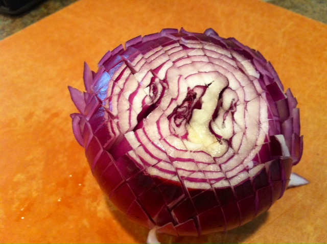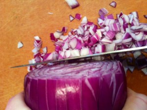 As you may have seen in other recipes on my blog, I always dice my onions by cutting off the top, removing the peel and making slices down through the onion toward the root (being careful not to cut all of the way through) then turn your onion 90 degrees and repeat. While holding the onion on its side, make slices all the way through to result in perfectly uniform onion pieces and completely eliminating watery onion eyes by leaving the exposure of the root to the very end.