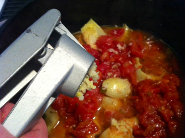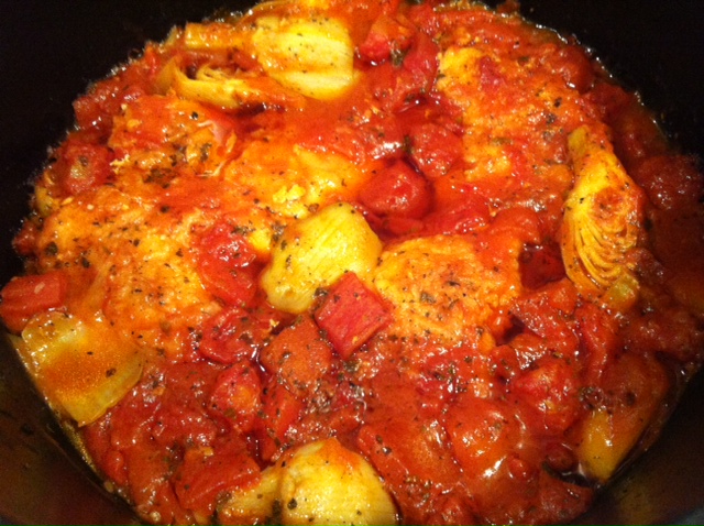 Heat olive oil over medium-high heat in a large dutch oven. I would highly recommend using a dutch oven if you have one. If you don’t, you can find them deeply discounted at Ross Dress for less or TJ Maxx or other discount home stores. If not, don’t sweat it, a deep (oven safe) pan (or crock pot for that matter) will work just fine. Add chicken. Make sure your pan is hot and you hear a good loud sizzle when you add your chicken. Cook on both sides for 3-4 minutes or until browned. Add artichoke hearts, stewed tomatoes, tomato paste, water, garlic, herbs, and pepper. Remove from heat. Cover and bake in a 350 degree oven for 1 hour.