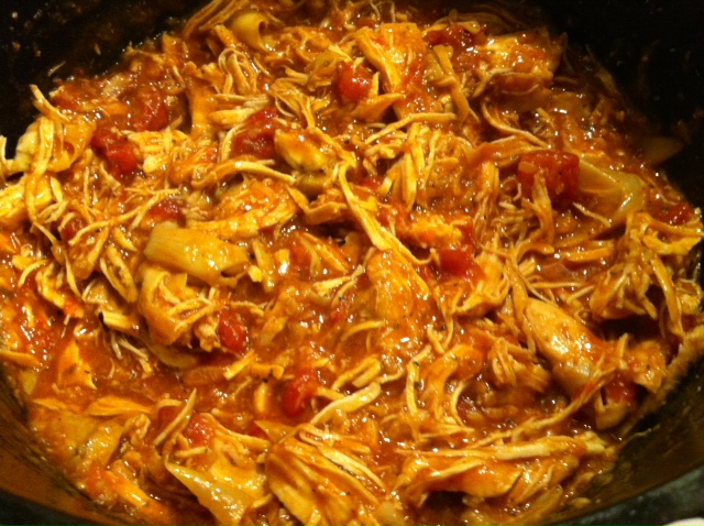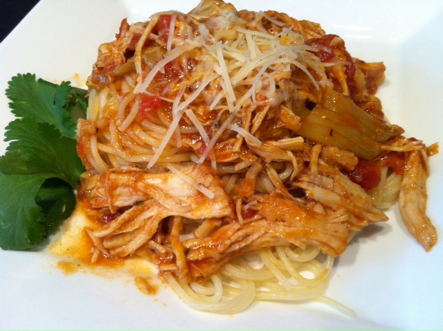 Serve over angel hair pasta or rice. Top with freshly grated Parmesan cheese. If you are looking for a healthier version, use some whole wheat pasta or don’t shred the chicken and serve whole breasts with no pasta. The chicken sauce itself is really pretty healthy.