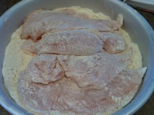 Mix flour, salt and pepper together. Rinse and trim chicken breasts, pat dry. Dredge in flour.
