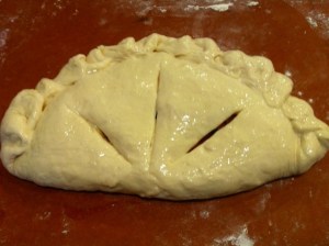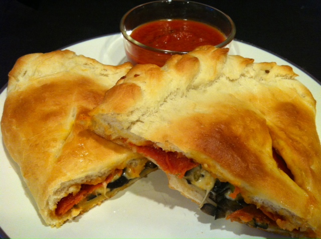 Fold other side over toppings to form a half-circle and crimp the edges. Roll edges inward, toward filling one pinch of dough at a time to make a fancy fluted edge. It really doesn’t matter too much what it looks like at this point because once it bakes, the ones that are all pretty unbaked end up looking a lot like the ones that are just pinched together. The most important thing is to just make sure that your edges are well sealed. Brush top with egg white and cut a few vents in the top (just deep enough to penetrate the top layer of dough). Place on a pizza pan or hot pizza stone coated with corn meal. Bake for 15-20 minutes or until nicely browned. Top and bottom should be firm and brown.