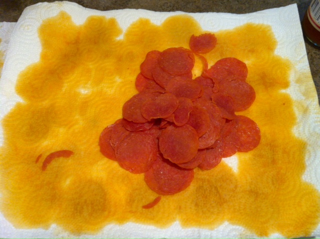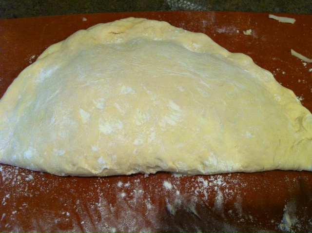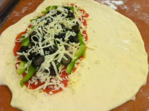 For Calzone, heat oven to 425 degrees F. Punch dough down several times to remove air bubbles. Divide dough in half. Roll dough into a circle (doesn’t have to be perfect) on a well-floured surface. Fill one half of the circle generously with your favorite sauce and pizza toppings, leaving a good inch around the edges with no sauce or toppings . We used pepperoni, pizza sauce, mozzarella cheese, pepperjack cheese, black olives and thinly sliced green peppers. *Tip- obviously none of us eat pizza because it’s great for our waistlines, but I do pop my pepperoni in the microwave for a quick minute on a bed of paper towels to remove most of the fat. It takes so much of the grease that I am always sopping up with a napkin out of the pizza but does not affect the taste or texture at all. I do this with salami too.