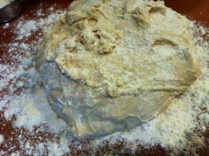 On floured surface, knead in 1/4 to 1/2 cup flour until dough is smooth and elastic, about 3 to 5 minutes. Flour amounts can really vary dramatically based so add the flour until your dough is really soft and elastic but not sticky. It really should not stick to your hands or your board. If it does, add more flour.