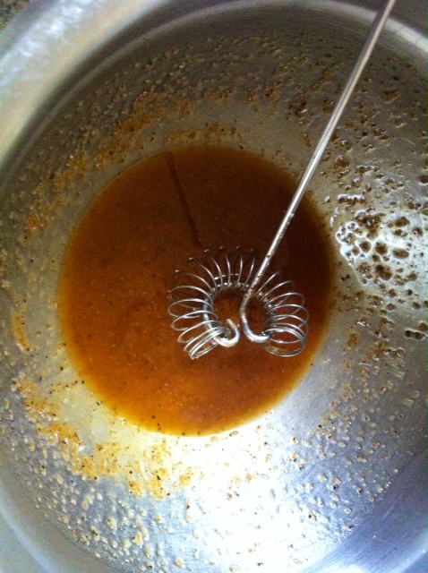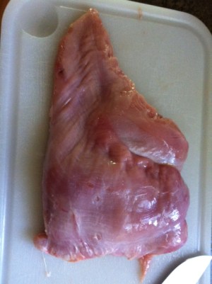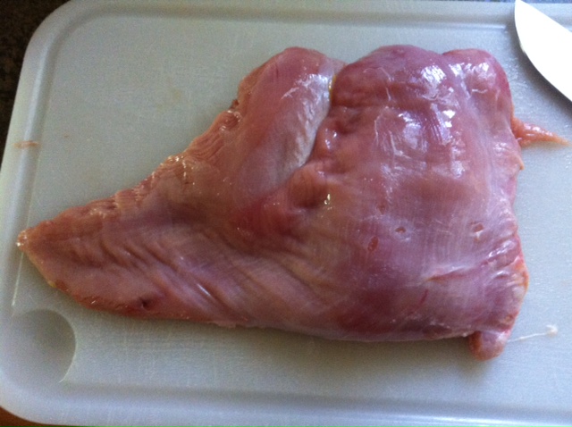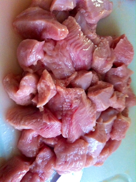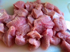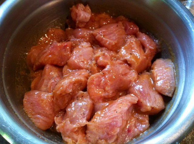 Cut meat into 1 and 1/2″ cubes. Mix marinade. Let meat marinade for a minimum of 2 hours. (Seriously, check out that giant turkey breast! It took up my entire cutting board!)