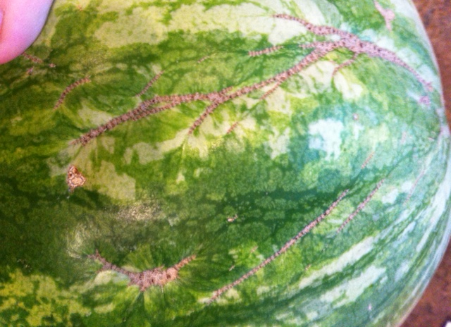 First of all, when picking a melon you want to always look for a melon that has a big yellow spot on one side. This will tell you that the melon ripened on the vine (the yellow spot is where it sat on the ground). If it is all green, chances are, it ripened off of the vine and won’t be nearly as sweet. The next thing I do is look for a melon with “bee stings”. These are brown lines on the melon that cause small indentions (see picture). Evidentially bees like the sweet melons… AND if there happens to be sugar balls (looks kind of like sap) coming from these bee stings, that is said to be sugar leaking out of the melon. I will usually find a few like these and see which is the heaviest which shows that it is extra juicy. A lot of people knock on the melon to see if it sounds hollow which I know works but for some reason they always sound the same to me so I generally don’t use this technique. I don’t know if this is all scientifically correct with the bees and all but I generally pick good ones using this method.