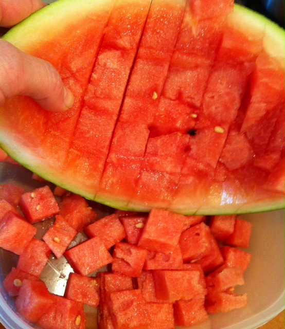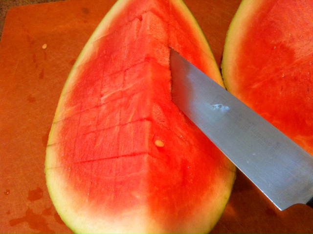 Now make 1″ incisions down through the whole watermelon quarter being careful not to cut too far into the rind. Turn the watermelon 90 degrees. Turn your knife on its side and make incisions 1″ apart through one side then turn and make the same incisions down through the other side.