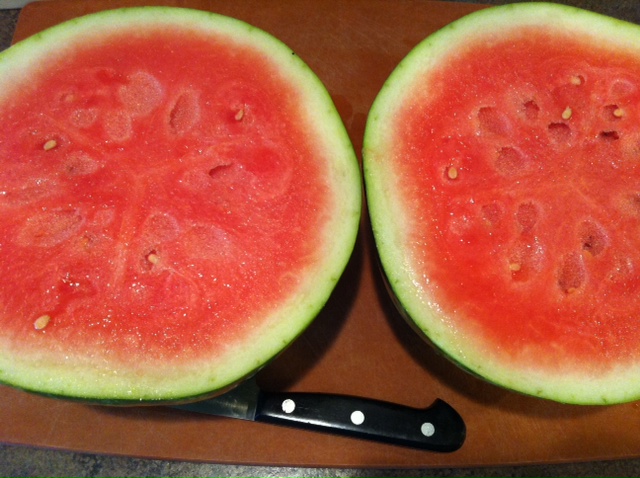 Alright, on to the cutting. Using a large sharp knife, cut the melon in half. Move one half off of the board and cut the other half in half again.