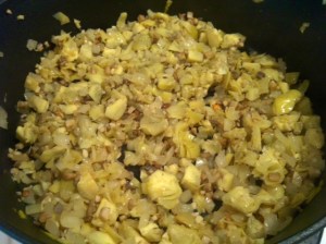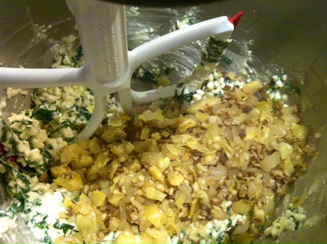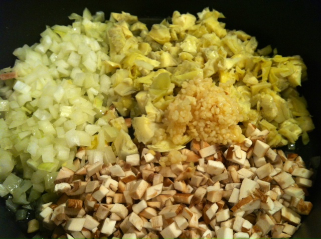 In a skillet, over medium heat, cook mushrooms, artichokes, onions, and garlic in olive oil until onions are tender. Drain any excess liquid and set aside to cool.