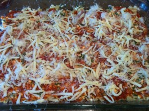 Cover and bake for one hour at 350 degrees. Remove foil and bake for an additional 10 minutes. Remove from oven and cool for 15 minutes before cutting and serving, allowing the lasagna to set up properly. Serve with rosemary french rolls and a side spinach salad.