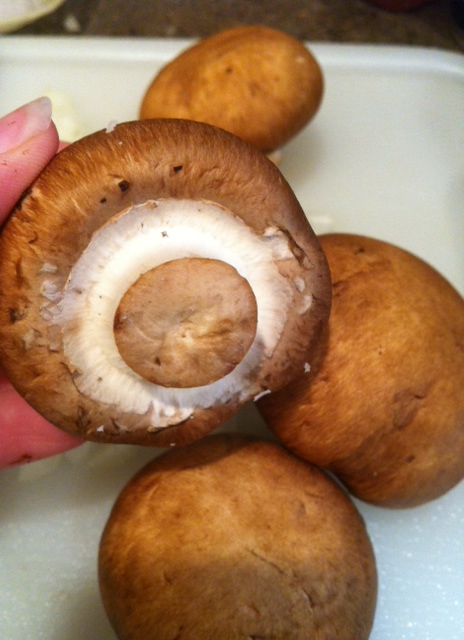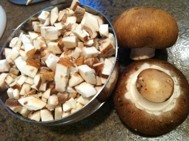 Clean mushrooms by rubbing them with a wet paper towel from the top-center, down as they have tiny little fibers that get all ruffled if you go against the grain. Don’t run water over your mushrooms because they will absorb the water. When your picking out your mushrooms, make sure you choose ones that are completely sealed under the cap, are firm and have no bruises. Trim off the end of the mushroom and dice.