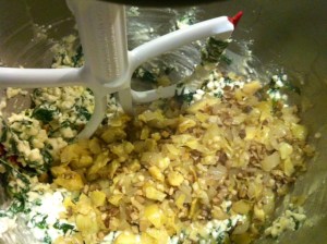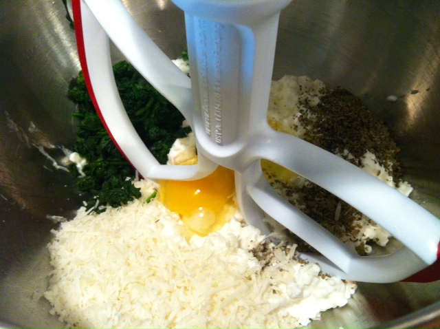 Combine cottage cheese (or ricotta if you choose), romano cheese, chopped spinach, salt, oregano, basil, pepper and egg. Mix just until combined. Add artichoke mixture and beat on low-speed for one minute. Some cottage cheeses are runnier than others so if your cottage cheese has much liquid in it, drain it using a mesh strainer. Just stir it in the strainer over a bowl and the milky liquid will drain out.