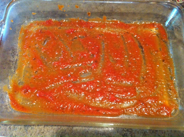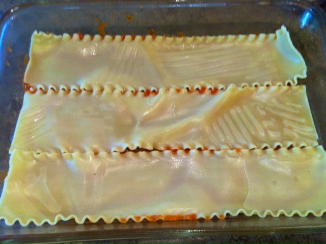 Spread a thin layer of sauce over bottom of 9×13 pan. This will ensure that your noodles to stick to the bottom. Lay 3 noodles down onto the sauce.