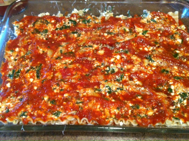 Repeat layering process starting with noodles 2 more times. (Okay, don’t tell anyone but I cheated and stacked 2 pieces of lasagna on top of each other for the main picture. If you want your lasagna that thick, you will need to use a deep pan like a roasting pan and double your ingredients :))