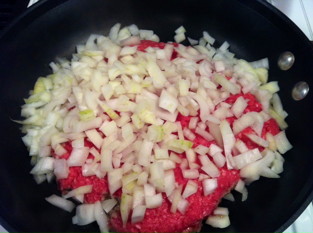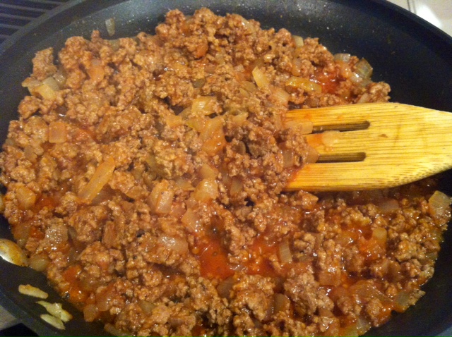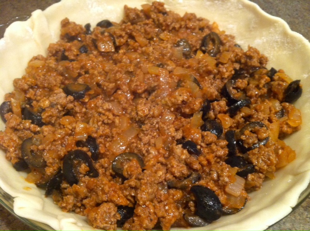 Brown hamburger with onions. Add mushrooms. Drain hamburger and add olives and tomato sauce. Add salt and pepper here too to taste. Heat until warm, pour onto bottom crust.