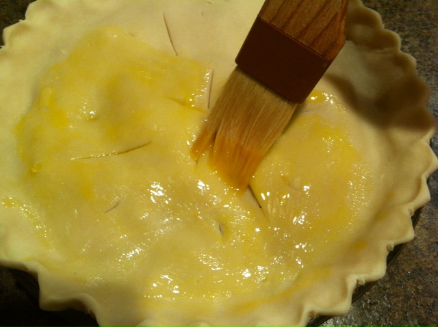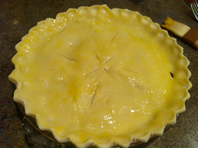 Brush egg yolk over the top of the crust and cut slits in the top so your pie can vent.