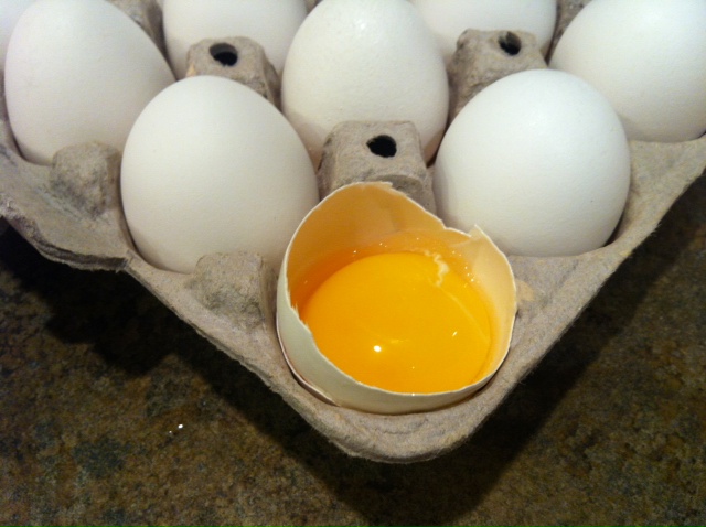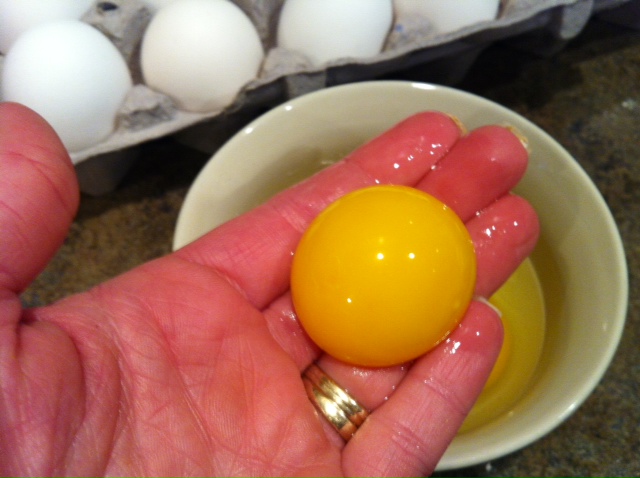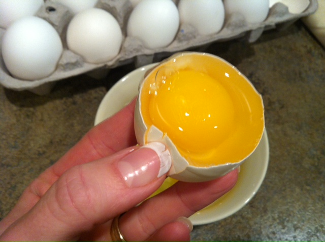 Beat one egg and one egg white well (do not discard the unused yolk). I have never owned an egg separator because I feel like my fingers work just as well and it dirties one less dish. Just crack the egg in half, removing the top half of the shell over a bowl. Turn the egg out into your fingers and let the white fall through your fingers. Drop the yolk back in the half shell until you are ready to use it.