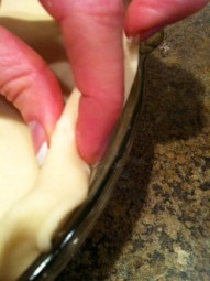 Place top crust over hamburger. Fold edges over the bottom crust and pinch them together until the whole thing is sealed. Crimp edges using the knuckle of your left hand (or right if you are a lefty) and pinch with your right hand around the whole crust.
