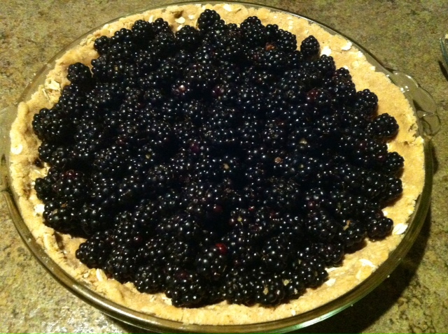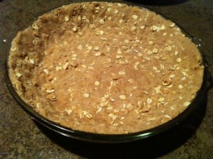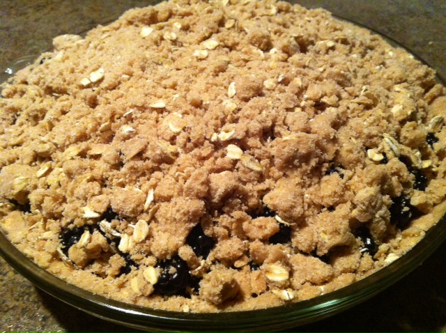 Pour half of crumble mixture into a greased pie pan. Press down on bottom of pan and up the sides, covering your entire pan evenly. Fill bottom crust with approximately 5-6 cups of your favorite berries.