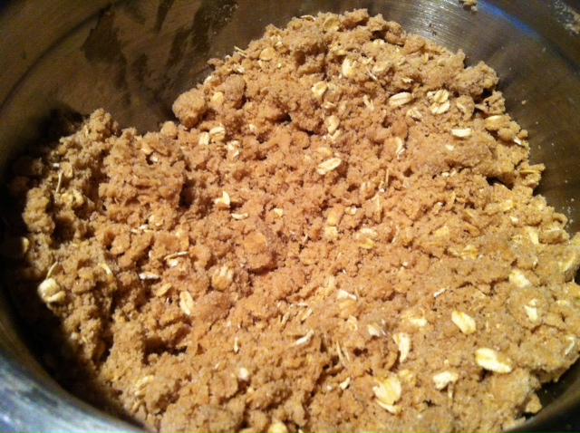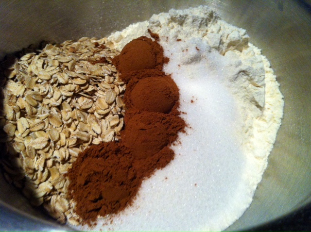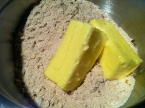 Preheat oven to 400 degrees. Mix all dry-ingredients together in a medium-sized bowl. Mix butter into dry mixture with a fork until the butter is evenly distributed and the mixture is crumbly.