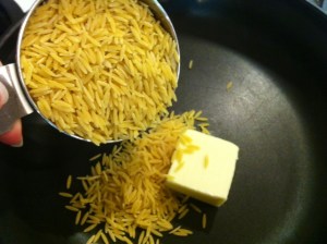 Melt butter in a heavy skillet over medium-high heat. Stir in Orzo and saute until lightly browned.