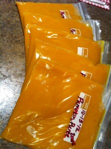 If you aren’t planning on using all of your puree now, divide it into freezer bags in 2 cup portions. I like to fold the top of the bag over before I start measuring. This will keep the top of the bag where you need a good seal from getting all gunky. Press the excess air from the bag, label bag and refrigerate for 3 days or freeze for up to 6 months.