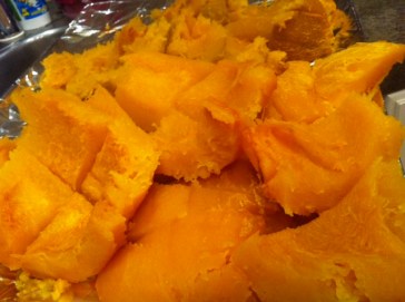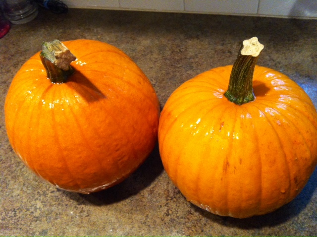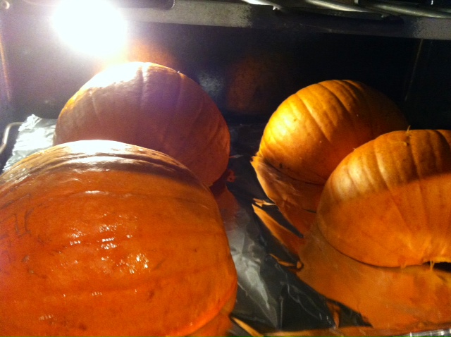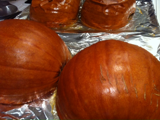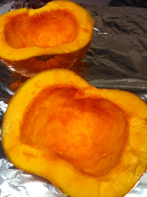 Line large cookie sheet with aluminum foil. Place pumpkin halves face down on cookie sheet. Bake at 375 for approximately 90 minutes or until pumpkins are soft. As you can see in my pictures, one of my pumpkins cooked much faster than the other so it was extra soft after it was baked.