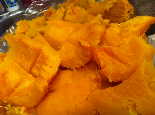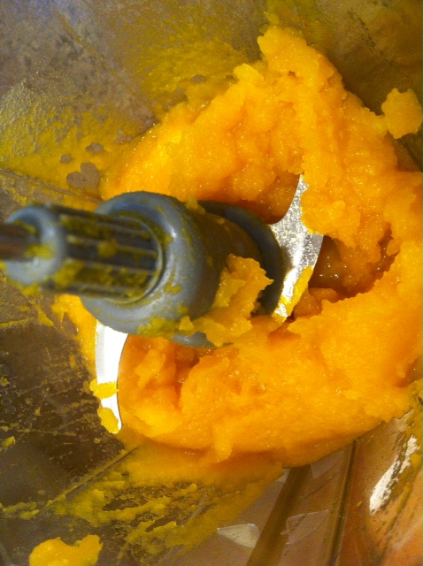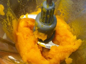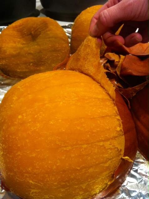 Cool until you can handle them safely. The skin of the pumpkin should peel off very easily. After you have them peeled, cut into chunks and place into a food processor or blender.