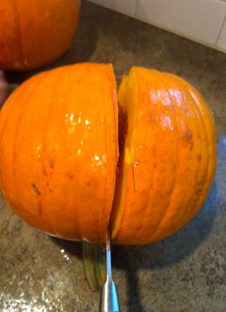 Cut pumpkin in half, vertically. These pumpkins are generally pretty firm so be careful. I find that a bread knife or serrated steak knife work better than my big sharp chef knives. Cut right up to the stem on both sides then break apart with your hands. You should then just be able to grab the stem and break it off pretty easily.